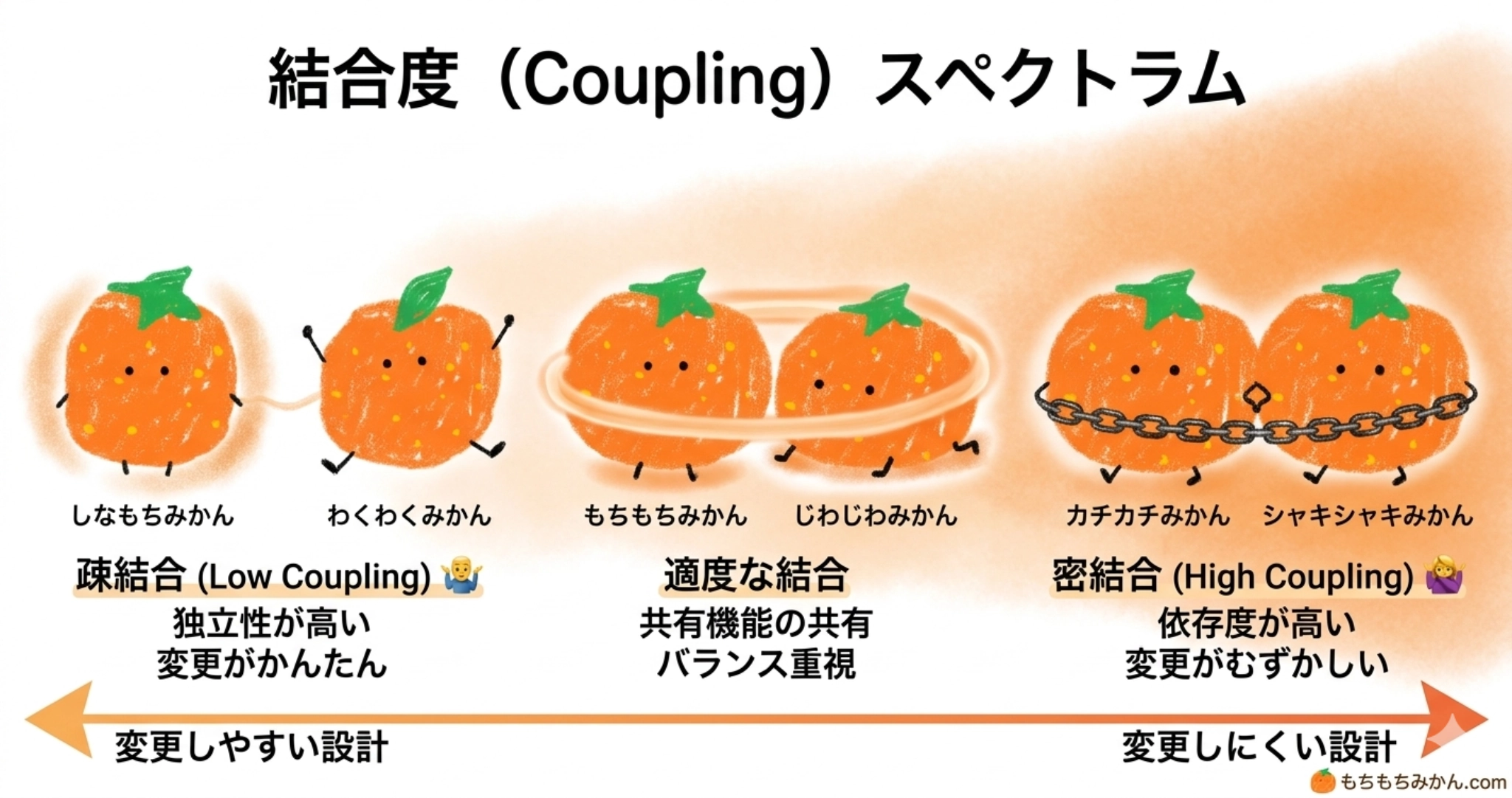 実際の設計は0か100かではありません。結合度は連続体なので、 「依存があるから全部悪い」ではなく、どこまで波及する依存かを見るのが大事です。