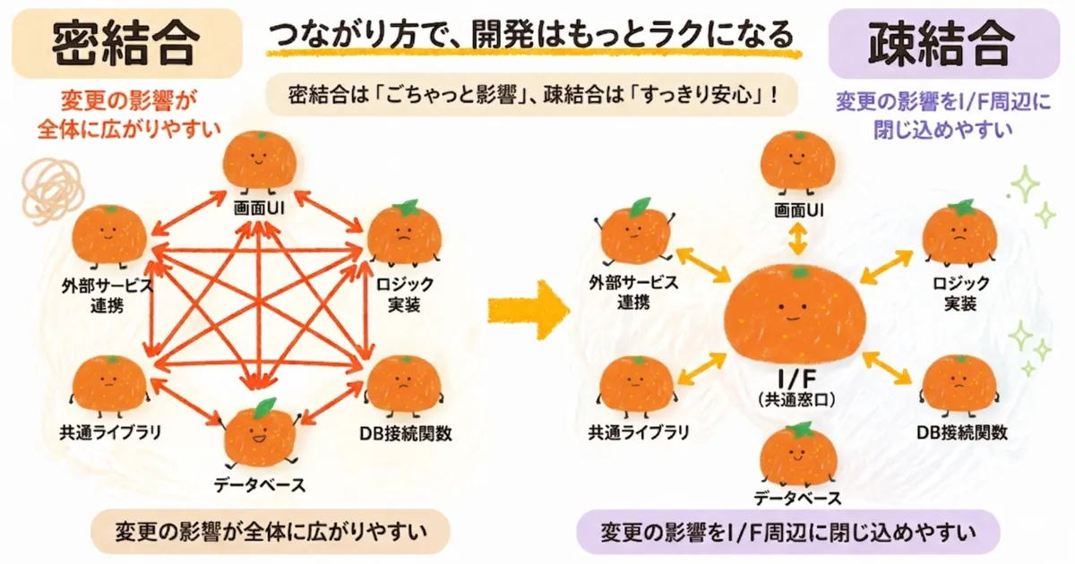 密結合は要素同士が直接つながるため変更の影響が広がりやすく、疎結合はI/F(共通窓口)を挟むことで影響を局所化しやすいことを表した図です。